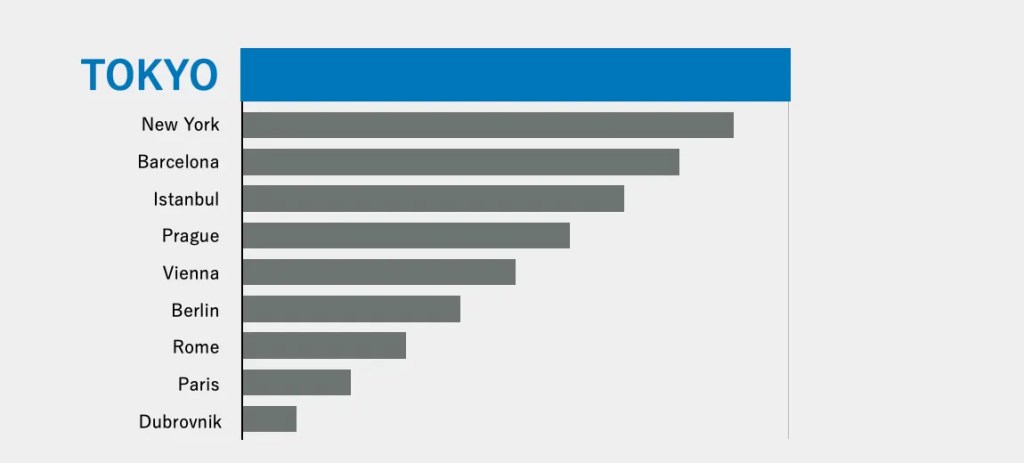 - Tokyo reigns supreme as the top city in a global traveler survey. Dominating four critical aspects—local hospitality, taxi service, urban cleanliness, and public transit—among 37 cities, Tokyo also clinched the No. 1 spot for ‘overall satisfaction’